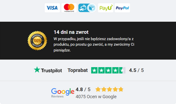 Dostawę realizuje Polska Poczta. Otrzymasz powiadomienie SMS-em i telefonicznie przed dostawą. Możesz zapłacić gotówką lub kartą, jeśli już opłaciłeś produkt, nie musisz nic dopłacać. W skrzynce pocztowej znajdziesz zawiadomienie o przesyłce. Jeśli produkt nie spełnia Twoich oczekiwań, możesz go zwrócić bez podania przyczyny w ciągu 14 dni od dostawy. Zwróć nienaruszony produkt w oryginalnym opakowaniu. Dołącz wypełniony formularz reklamacyjny/zwrotu, a my zwrócimy Ci pieniądze lub wymienimy produkt na bardziej odpowiedni o tej samej wartości bez dodatkowych kosztów. W ten sposób zapewniamy zadowolenie naszych stałych klientów.